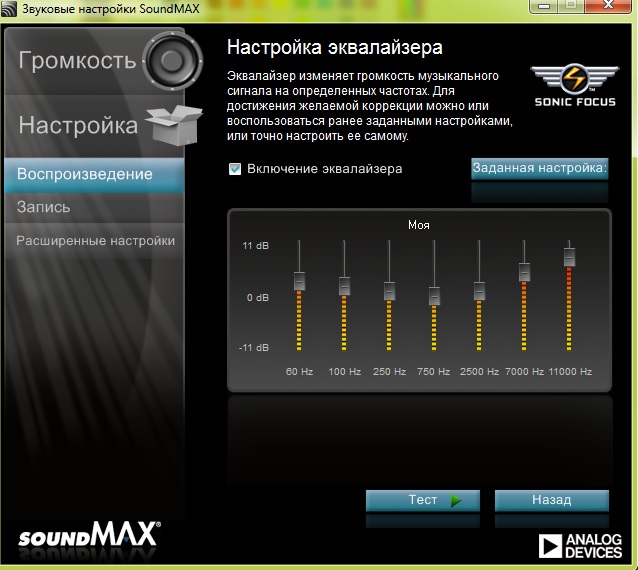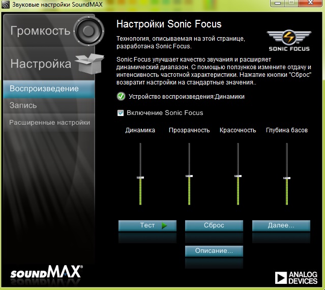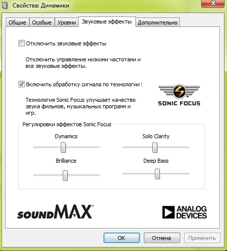 Управление НЧ в свойствах динамиков конечно же включено? И возможно, в проге которая идет в дровах звуковухи? У меня звуковуха SoundMax Integrated Digital HD Audio. С технологией Sonic Focus В проге которая идет нет такого параметра как именно управление НЧ. В свойствах есть на закладке звуковые эффекты (в предпоследнем фото видно). Если отключить, точнее поставить там галочку, то звук становится "никакой"...глухой, ни высоких нормальных ни низких..один середняк. Сообщение отредактировал Alex~ - 23.9.2014, 0:58 -------------------- Пропаганда не делает из людей идиотов, она изначально на них рассчитана.