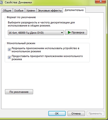 На вкладке дополнительно в свойствах динамиков выбираешь частоту 24 бит,44100 Гц. Что получается? Легче не становится. Да кстати это не только процесс flash plaeyr plugin отрубает всем сабвуфер и оставляет только себе. Но и только сейчас заметил что если запустить игру с компа, то она тоже вырубает сабвуфер локальным медиа плеерам и оставляет только себе. -------------------- Пропаганда не делает из людей идиотов, она изначально на них рассчитана.