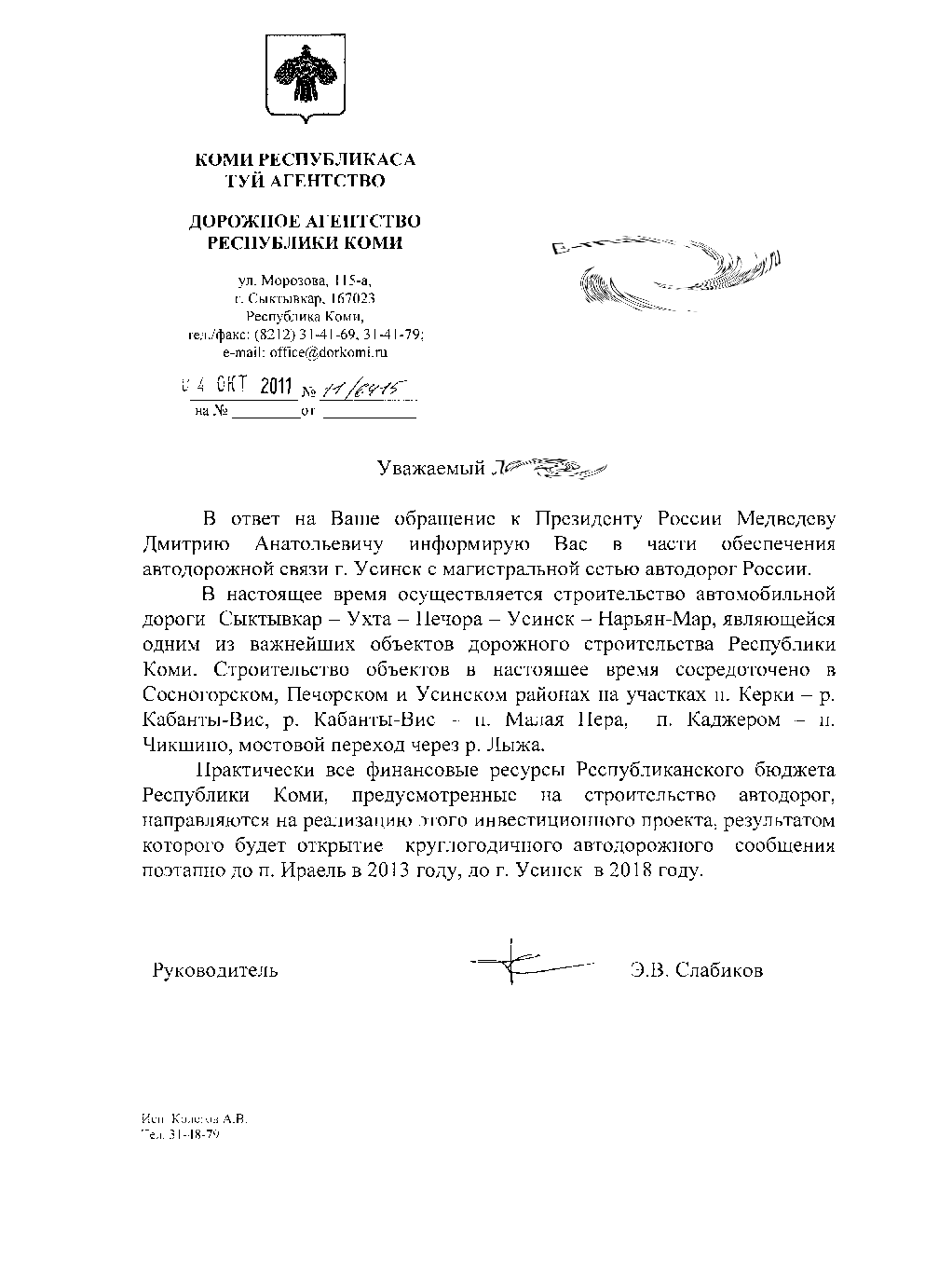 Э.Слабиков напомнил, что в 2011 году на дорожную отрасль было выделено 4,6 миллиарда рублей. Почти половину средств направили на капремонт трассы Сыктывкар — Ухта. Впрочем, освоить удалось не всю сумму: из-за нехватки железнодорожных вагонов дорожники не смогли вовремя подвезти щебень и другие необходимые материалы. Но, как заверил Э.Слабиков, оставшиеся средства будут переведены на будущий год.