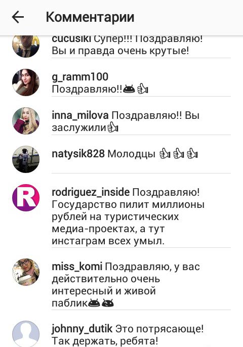 "Как отмечает администрация аккаунта, интерес пользователей r_komi и потенциальных туристов проявляется в комментариях к опубликованным постам-фотографиям. Зачастую пользователи, увидев тот или иной пейзаж, интересуются, «где находится эта красота», и получают исчерпывающие ответы, как от рядовых пользователей, так и от администраторов проекта. Судя по благодарным комментариям, полученная информация приносит вполне реальную практическую пользу." "Инстаграм всех умыл" :-)))) -------------------- Предчувствуя неладное, Му-му еще с вечера наелась пенопласта....