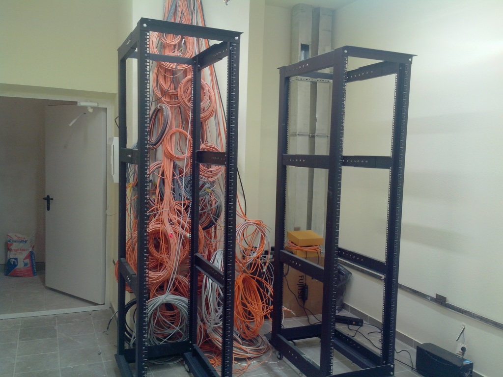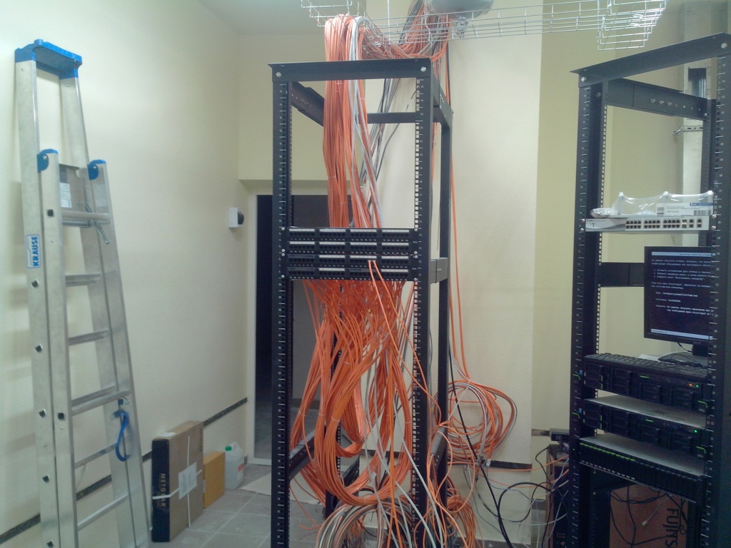 Монтируем почти все, у нас все сложно, ну по крайней мере для меня. Это уже 3-я серверная, предыдущие 2 поменьше будут, серверные между собой на оптике, шкафы на 6-ой категории.
