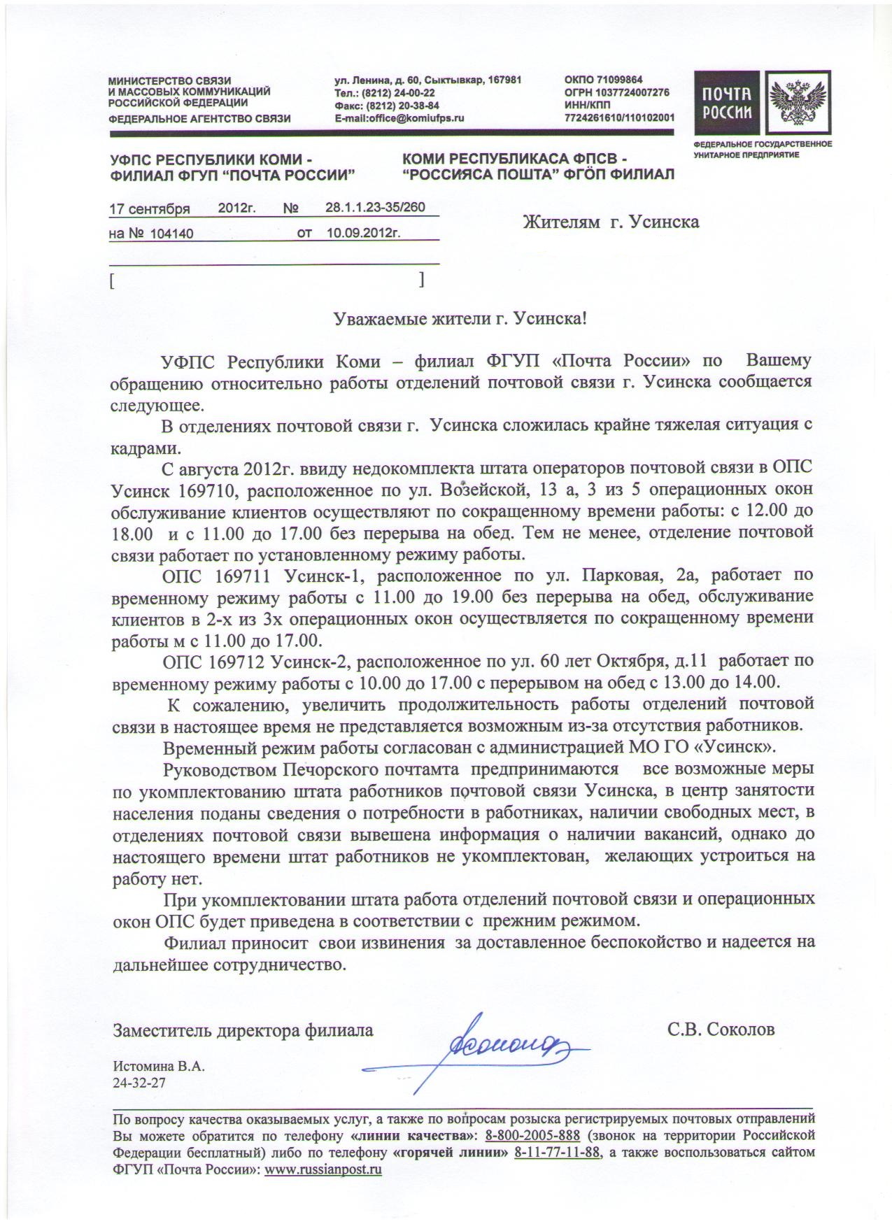 Куда писать не известно. Так же на днях потеряли посылку жены. Пришла на Парковую, спрашивает, где искать правды и что делать, и людей подставили, которые на деньги попали, выслав товар и сама впрогаре. Ей начальница отделения так просто отвечает: закажите снова. Вот и весь сказ. Стала звонить супруга в главное почтовое отделение Усинска, ей там начальница отвечает, что ни чем не можем... Что ж, случается....