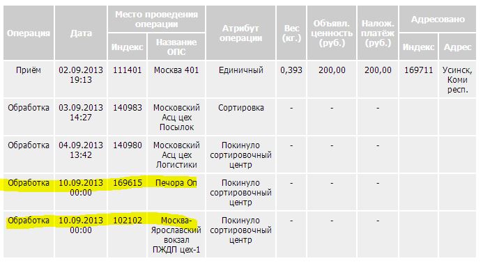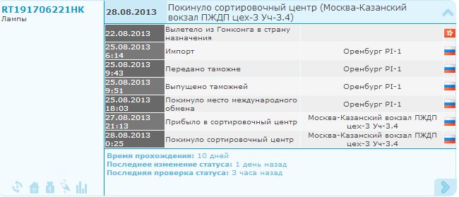 Один Импорт 18.09.2013 4:29:00 460981 Оренбург PI-1 0,144 - - 169712 Усинск, Коми респ. Приём на таможню 18.09.2013 9:59:00 460981 Оренбург PI-1 0,144 - - Таможенное оформление 18.09.2013 10:21:00 460981 Оренбург PI-1 Выпуск таможни 0,144 - - Обработка 19.09.2013 17:25:00 460981 Оренбург PI-1 Покинуло место международного обмена - - - Обработка 22.09.2013 2:24:00 102027 Москва-Казанский вокзал ПЖДП цех-3 Уч-3.4 Прибыло в сортировочный центр - - - Обработка 23.09.2013 17:24:00 102102 Москва-Ярославский вокзал ПЖДП цех-1 Прибыло в сортировочный центр - - - Обработка 27.09.2013 13:06:00 102102 Москва-Ярославский вокзал ПЖДП цех-1 Покинуло сортировочный центр - - - Обработка 22.10.2013 0:00:00 167950 Сыктывкар УОПП Покинуло сортировочный центр - - - Вручение 29.10.2013 0:00:00 169712 Усинск 2 Вручение адресату 0,144 - - Два Приём 02.12.2013 15:45:00 170963 Тверь УОПП-2 Партионный 10,120 6230,10 - 169712 Усинск, Коми респ. Обработка 03.12.2013 0:00:00 170963 Тверь УОПП-2 Покинуло сортировочный центр - - - Обработка 04.12.2013 4:36:00 140983 Московский Асц цех Посылок Сортировка - - - Обработка 04.12.2013 9:01:00 140980 Московский Асц цех Логистики Покинуло сортировочный центр - - - Обработка 09.12.2013 0:00:00 102102 Москва-Ярославский вокзал ПЖДП цех-1 Покинуло сортировочный центр - - - Обработка 15.01.2014 5:13:00 169615 Печора Оп Покинуло сортировочный центр -------------------- Свобода лучше чем несвобода наличием свободы.