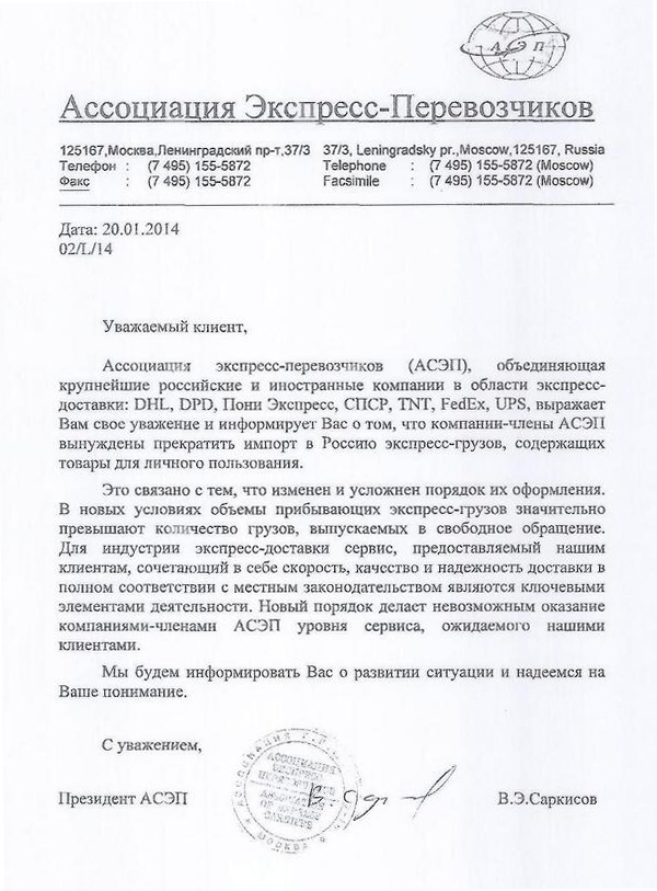 Обновлено. Любопытно, что только что было опубликовано опровержение ранее появившихся сведений. Как сообщил президент ассоциации экспресс-перевозчиков Владимир Саркисов, АСЭП не направляла клиентам письмо о прекращении импорта в Россию товаров для личного пользования операторами DHL, DPD, "Пони Экспресс", СПСР, TNT, FedEx, UPS. «Это проект письма, который был направлен для обсуждения членам ассоциации. Кто-то поторопился и выложил его в интернет. Консолидированной позиции операторов по этому вопросу нет, каждая компания будет принимать решение самостоятельно», — заявил Саркисов. -------------------- Есть такая профессия - Родину автоматизировать... со всеми вытекающими (с)