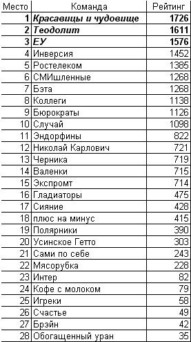 Подобъем итоги. Провели за сезон три "черных" игры, победителями в которых стали "Теодолит", "Красавицы и Чудовище" и "EU". С следующем сезоне, что ли, сделать больший упор на медийки? -------------------- Мой Твиттер: https://twitter.com/mexbaza