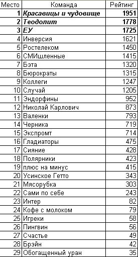 Как мне подсказывают игроки ведущие наш протокол, мы про...ли восемь вопросов! ВОСЕМЬ!!!! Это первое место с запасом! Это треть от того, что мы могли взять! И еще я был удивлен общим низким уровнем ответов. С нашими 15 очками не расчитывал выйти из пятерки снизу, а, оказалось, всего двух не хватило до призового третьего. Не сказал бы, что было много "гробов", но, ИМХО, были неоднозначные. Например, про снеговиков, про день рождения Рима. Кстати, некоторые сетуют на жесткость жюри. Это не жестко. По сравнению с Сыктывкаром, у нас очень лояльное жюри. Я бы даже сказал чрезмерно лояльное. На республике никто не спрашивал, все ли сдали ответы. Если при сигнале окончания минуты обсуждения бумажка с ответом не была поднята вверх - ее уже никто не брал. И в полемику на тему считать ли "черные" "неграми" никто бы не вступал. Нам не засчитали ответ "Пионер" о названии арктической станции, потому что она называлась "Пионерская". -------------------- Все что я здесь пишу - это мое личное мнение. Если оно кому-либо не нравится, то мне на это наплевать!