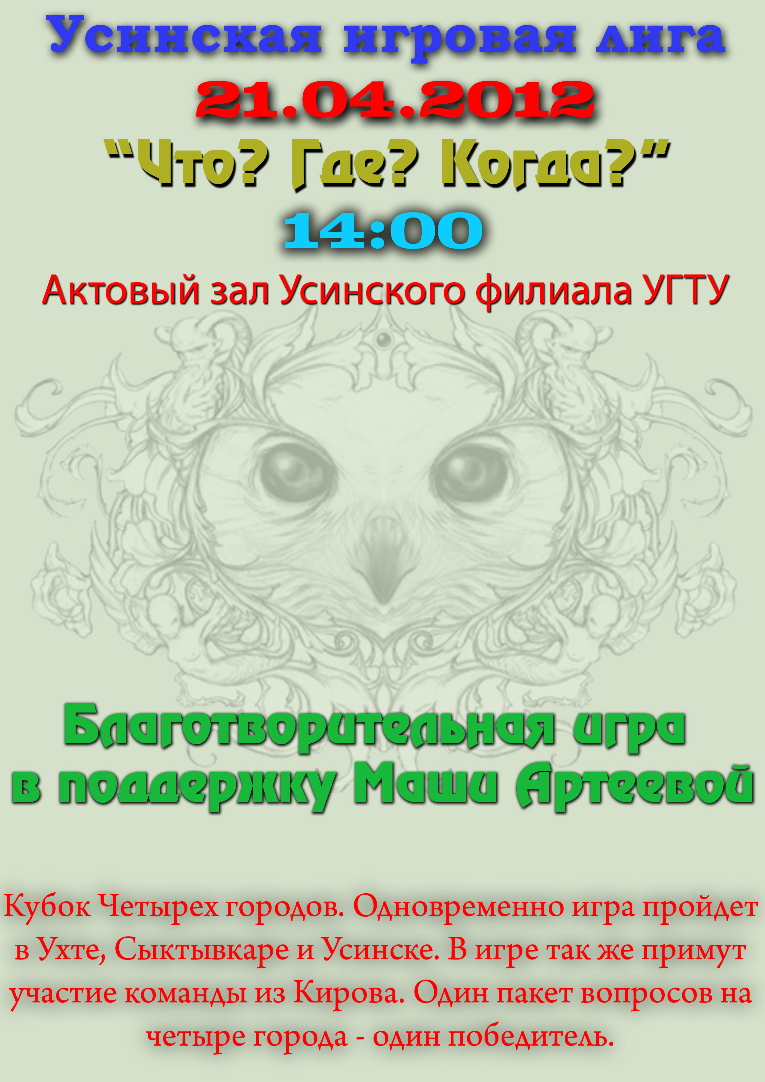 http://vk.com/event37685544 - встреча Усинской Лиги на игру http://vk.com/event37908945 - встреча от Республиканской Лиги на игру http://vk.com/usliga - группа УИЛ http://vk.com/chgk_komi - группа Республиканской Лиги. |