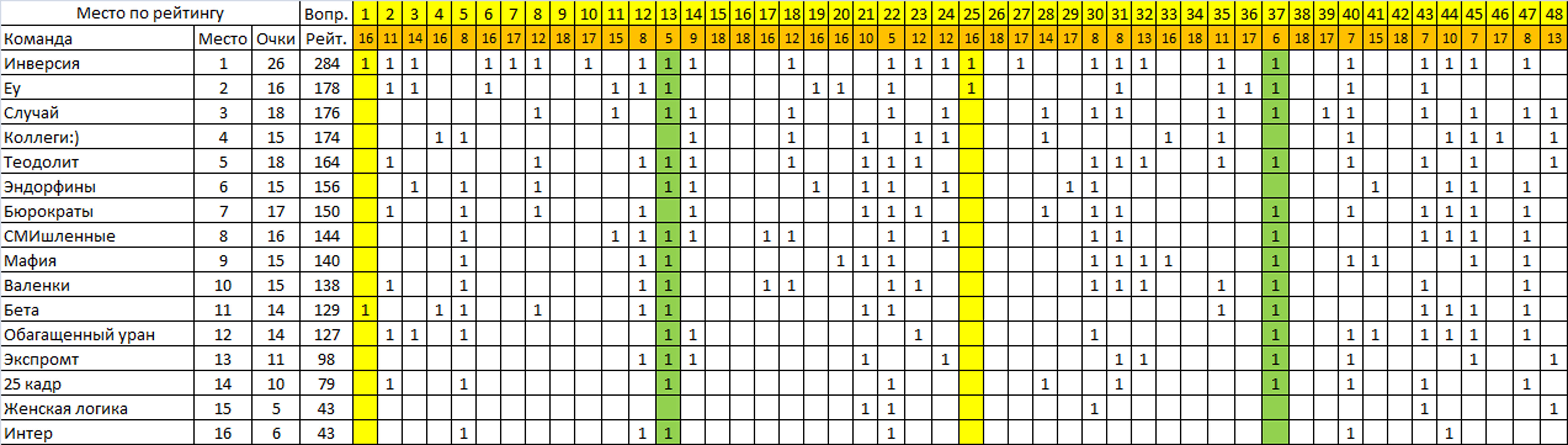Запомнился вопрос про растение семейства шишконосных, и то, что ЕУ единственные на него ответили. Молодцы. Но и мы, кстати, кое на что одни отвечали.Тоже молодцы) |