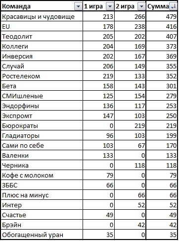 Вы единственные что ли)) Теодолит тоже свои бланки подготовил. Очень хорошо. Рейтинг важен, на игре 3 ноября будет важное объявление, касающееся рейтинга ЗББС и "Плюс на минус" - вроде, одна и та же команда. Надо уточнить у Паши. Хотя я бы такие переименования во время сезона запрещал. Там просто не было Стаса, вот и переименовались как то. По итогам двух игр: Спасибо. -------------------- Я сказал всё, что нужно было сказать, и я уверен в своих аргументах...