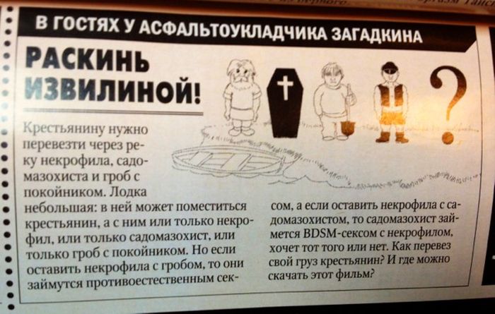 Загадка Берет крестьянин гроб и везет на кладбище или может в часовню на отпевание. Пусть этот некрофил узнает что трупы чувствуют -------------------- И только за жабры подвешенный ерш