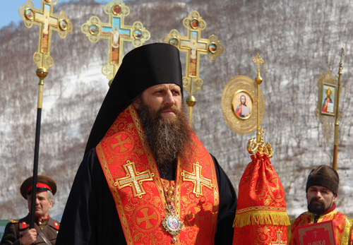 (Hun) Перед вами архиереи Петропавловской и Камчатской епархии Руской православной церкви владыка Артемий в богослужебном облачении как видно на плечах его надет омофор - широкая лента с изображениями крестов, спускающаяся обоими концами на грудь. Обычно спереди сшитый или закрепленный пуговицами. Омофор в переводе с греческого языка означает "нести на плечах" (ὦμος — плечо и φόρος — нести) Что же сиволизирует данный предмет? -------------------- И только за жабры подвешенный ерш