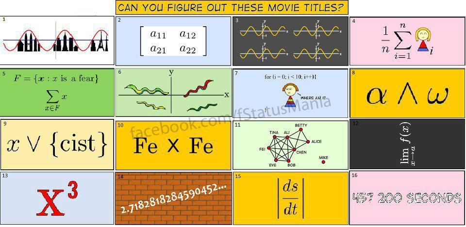 Есть такое вот интересное кино. Не знаю, может кто уже и выкладывал подобное. В общем предлагаю отгадать все фильмы. Только чтобы не пачкать топик, предлагаю сначала максимально подготовиться и запостить максимальное количество фильмов. А лучше отгадать сразу все. Вот. Сам, честно, не знаю на все ответ, но на 13 точно отпишусь. Итак задание: Какие названия фильмов зашифрованы здесь сумасшедшими учеными? (PS: Названия, конечно, взяты оригинальные, англоязычные).
