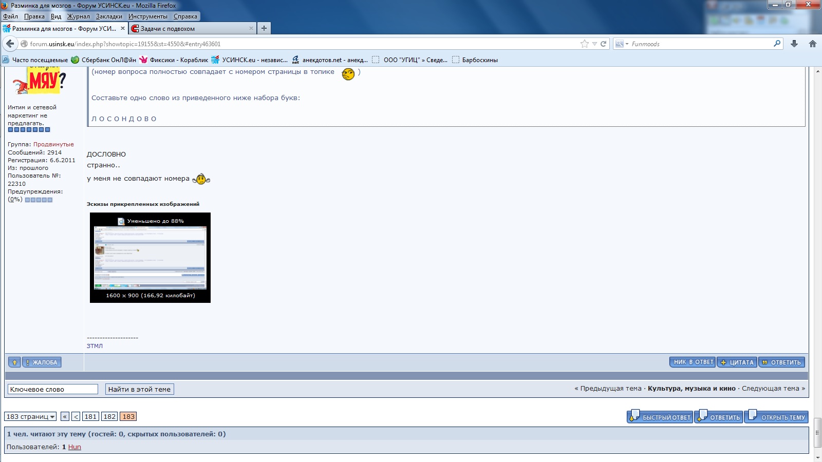 Вопрос О183: (с просторов инета) (номер вопроса полностью совпадает с номером страницы в топике Составьте одно слово из приведенного ниже набора букв: Л О С О Н Д О В О ДОСЛОВНО странно.. у меня не совпадают номера -------------------- Мечты уносят в даль...