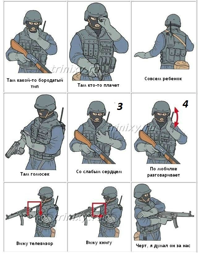 Вопрос № 78 от 03.10.2013: Перед вами шуточные варианты перевода некоторых жестов языка спецназовцев. Что на самом деле обозначают жесты под номерами 3 и 4? вызываю Брюса Уиллиса.. -------------------- Забанен