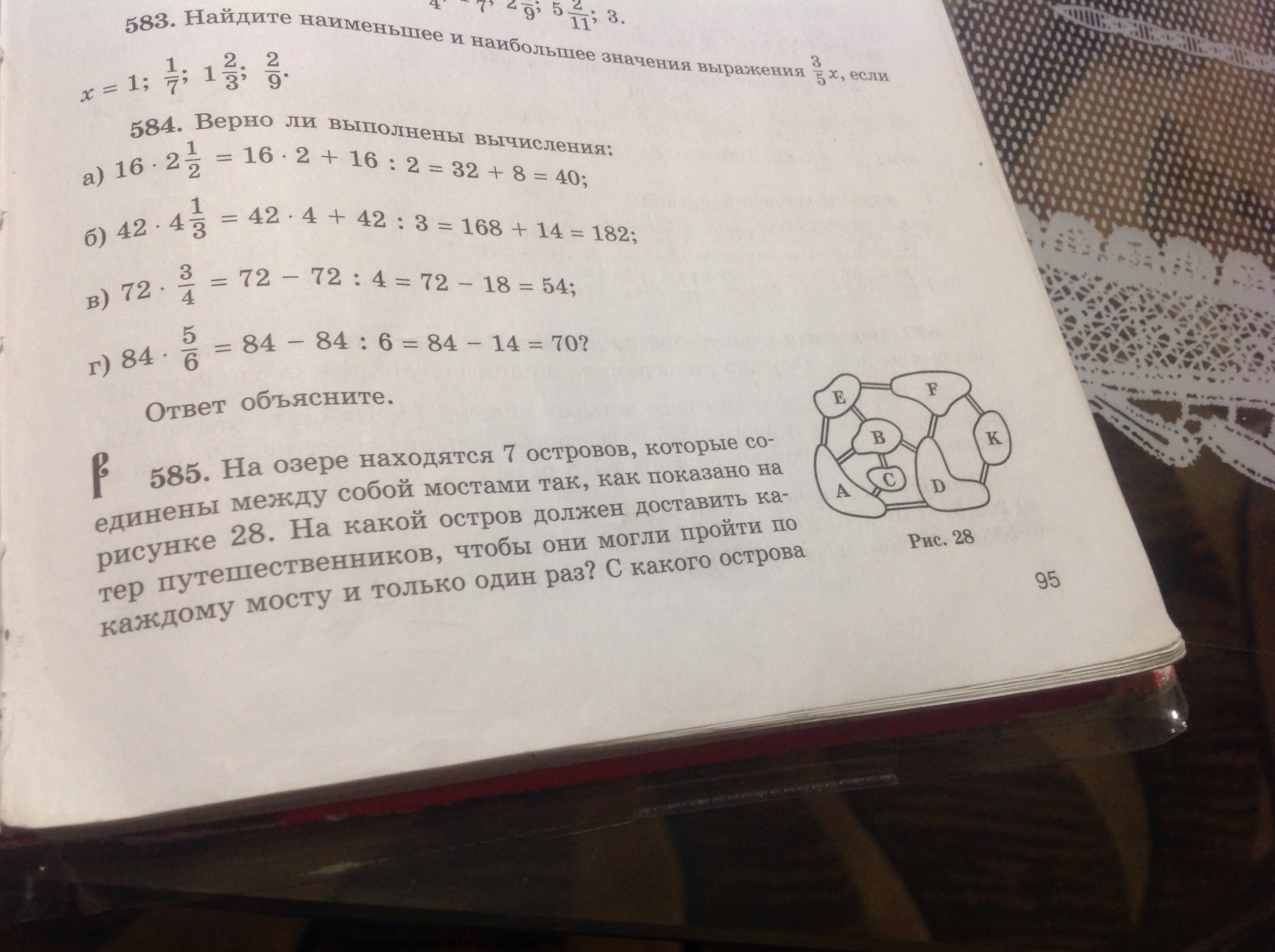 Может и кому-то легко покажется, но кому- то размять извилины На Озере изображены 7 островов, которые соединены между собой мостами так , как на изображено на рис. 28. На какой остров должен доставить катер путешественников, чтобы они могли пройти по КАЖДОМУ мосту и только ОДИН раз. Расскажите весь путь от начала до конца. 6 класс, но как доп.задание Сообщение отредактировал Миша - 19.11.2014, 23:45 |