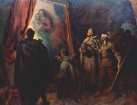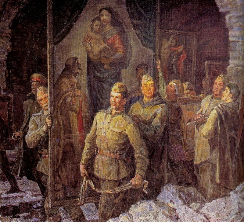 Когда религию объявляют опиумом для народа, а церкви и храмы уничтожаются, иконы сжигаются, то вряд ли бы советская цензура пропустила коленопреклонённого воина, защитника Отечества, оплот и надежу, перед изображениями, насильно стираемые сверху. Значит, надо поместить изображения святых туда, где они смотрелись бы не как религиозные символы, а как искусство. К тому же, воины не звери - им не чужда красота даже в городе врага.
