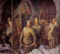 __________ В общем, Чхартишвили называл душераздирающим харакири (сеппуку в зачёт). И новый вопрос: На картине советского художника воин-освободитель стоит на коленях перед Богородицей и Христом. У художника не было проблем с цензурой, ведь герой в ней. Назовите её двумя словами, начинающимися на соседние буквы. |