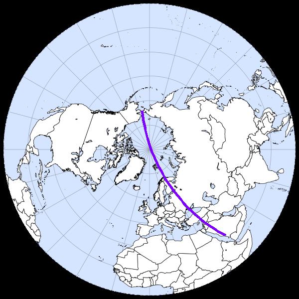 на северо-запад Учитывая то что Земля круглая, то через две точки можно провести множество "прямых" и тем более "кривых" но для направления киблы выбирается кратчайшее растояние по поверхности Земли, так называемая ортодромия (по которой кстати летают самолеты). Правильный ответ на Север (см картинку) P.S. Вопрос немного получился не корректным при составлении хотел выбрать киблу строгий север, по прикидке выбрал Беренгов пролив, но при расчете оказалось что нужно было брать не Беренгов пролив, а Западную границу Канады. Погрешность составила ~10° с отклонением на запад что при определении направления молитвы на таком растоянии считается допустимым. -------------------- И только за жабры подвешенный ерш