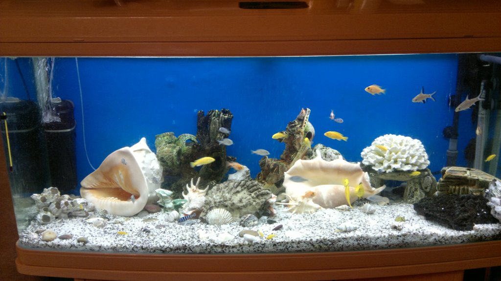 Два попугая, петушок, два мечиносца, четыре сомика (один большой и три малых, не выросли пока), улиток нет =( Аквариум 70 литров...