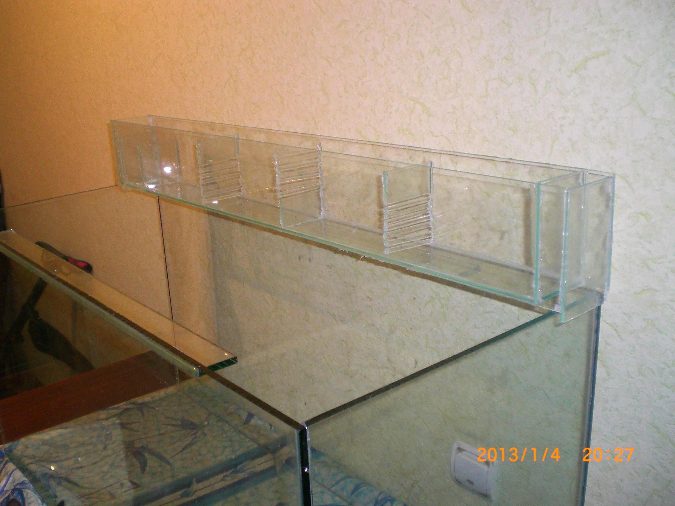 Теперь опишу подробнее. Узкий отсек перед первым -сквозной. Через него будет протянута трубка для подачи воды. Затем идут 4 отсека для наполнителей. 5 отсек это слив, он тоже пустовать не будет, в него положу крупнопористую губку, помимо фильтрации она предотвратит журчание воды. Узкий 6 отсек это страховочный слив на всякий пожарный. Еще один узкий отсек после 6 предназначен исключительно для фиксации конструкции на торцевом стекле.