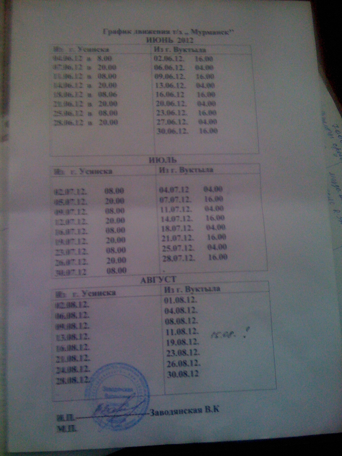 1. Магазин «Светоч» г. Усинск, ул. Строителей, д. 9 (с 10-00 до 19-00, обед 14-00 – 15-00; суббота, воскресенье с 10-00 до 16-00) 2. Справки, продажа билетов - тел.: 8 9129585016 Расписание движения теплохода на май, июнь, июль: Усинск-Вуктыл Вуктыл-Усинск среда 8-00 четверг 24-00 (по прибытии т/хода) суббота 15-00 понедельник 08-00 (по прибытии т/хода) Примечание: при перевозке автомобиля, согласно кодексу ВВП, правил технической эксплуатации судов п. 4.1.8 запрещена перевозка пассажиров (один сопровождающий) fff, Это расписание теплохода бугульма с газета усинская новь |