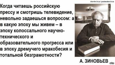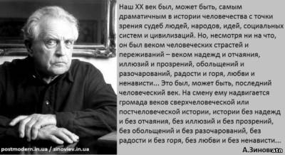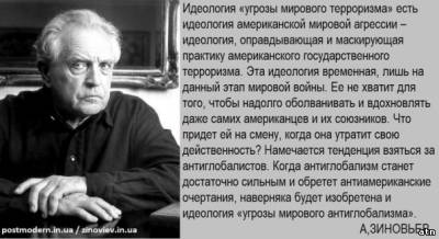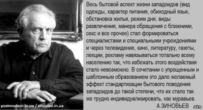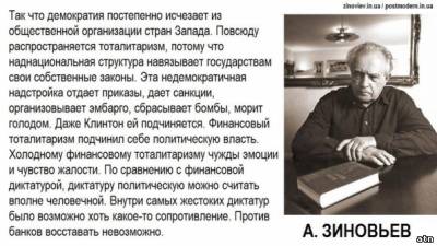 Так он и высказал свое мнение по глобализации на основании того,что он в ней разглядел. Вы,ребята,частенько путаете глобализацию как расспространение новых технических(научных) достижений,против чего вряд ли разумный человек будет выступать(а Зиновьев разумный) и глобализацию о которой он пишет. Он пишет как раз о том,что наука развивается,а люди(обыватели) в мире,особенно в определенных странах,намерено оглупляются(образование для бедных,тв) и оскотиниваются(тв,интернет,реклама и т.п.).Все взаимосвязано. Под видом глобализации науки,торговли и т.п. открываються национальные экономики и загоняются в долги,ставятся под контроль. Затем уже местная элита под руководством кредиторов уничтожает человеческий потенциал в своей стране(о чем я выше писал-перечислял). Кто выступает всегда в роли кредиторов надо объяснять?