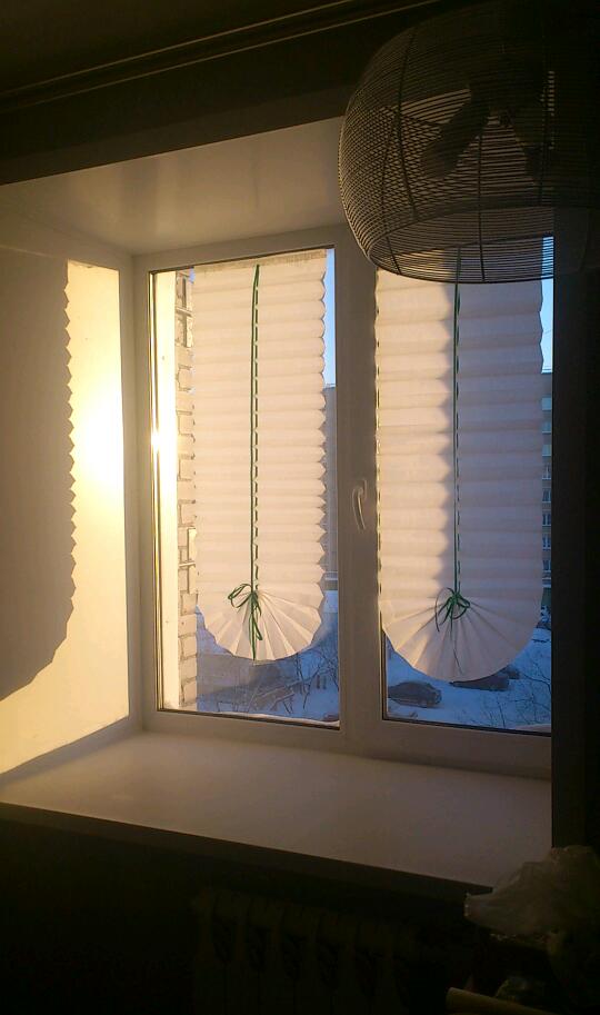 пока нет штор, соорудила вот такие жалюзи Прикольно))) Никогда бы не догадался))) А можно было собрать и сделать вырезы, как снежинки из салфеток, было бы симметрично и оригинально. -------------------- Настоящему индейцу завсегда везде ништяк!