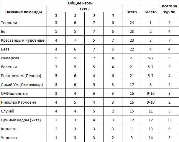 Как и обещал выкладываю таблицу с баллами. выкладываю общую по турам и за тур ЛК.
