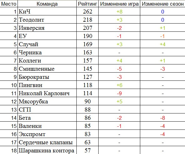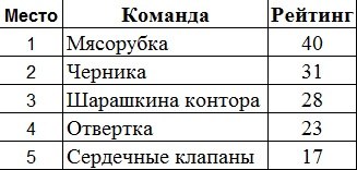 2. "Красавицы и Чудовище" (Усинск) - 24. 3. "ИТЦ" (Ухта) - 23. 4. "Теодолит" (Усинск) - 23. 5. "Додо пицца" (Сыктывкар) - 22. 6. "Маразм" (Сыктывкар) - 22. 7. "Инверсия" (Усинск) - 22. 8. "Высокий уровень" (Ухта) - 20. 9. "EU" (Усинск) - 20. 10. "Палата №6" (Сыктывкар) - 19. 11. "ТриО" (Сыктывкар) - 18. 12. "Случай" (Усинск) - 18. 13. "Коллеги" (Усинск) - 18. 14. "СМИшленные" (Усинск) - 18. 15. "Расхитители гробов" (Сыктывкар) - 17. 16. "Зайцева +" (Сыктывкар) - 17. 17. "Просто гении" (Сыктывкар) - 17. 18. "Служба коротких сообщений" (Ухта) - 17. 19. "Е=МС`2" (Ухта) - 17. 20. "Черника" (Усинск) - 17. 21. "6 евро" (Ухта) - 15. 22. "Пингвин" (Усинск) - 15. 23. "Бюрократы" (Усинск) - 14. 24. "Николай Карлович" (Усинск) - 14. 25. "Женская логика" (Сыктывкар) - 12. 26. "Мясорубка" (Усинск) - 12. 27. "Бета" (Усинск) - 12. 28. "Бобры" (Сыктывкар) - 11. 29. "Томулов" (Ухта) - 11. 30. "Молодцы" (Ухта) - 11. 31. "Ст.59" (Ухта) - 11. 32. "СГП" (Усинск) - 11. 33. "Экспромт" (Усинск) - 11. 34. "Валенки" (Усинск) - 11. 35. "Безумные умницы" (Сыктывкар) - 10. 36. "Бодрые сосиски" (Сыктывкар) - 10. 37. "Триумф" (Ухта) - 10. 38. "Северный пегас" (Ухта) - 10. 39. "Мы не "Мы" (Сыктывкар) - 9. 40. "Лисий ум" (Сыктывкар) - 9. 41. "Команда-команда" (Сыктывкар) - 9. 42. "Сердечные клапаны" (Усинск) - 9. 43. "Шарашкина контора" (Усинск) - 8. 44. "УТЖТ" (Ухта) - 3. -------------------- Мой Твиттер: https://twitter.com/mexbaza