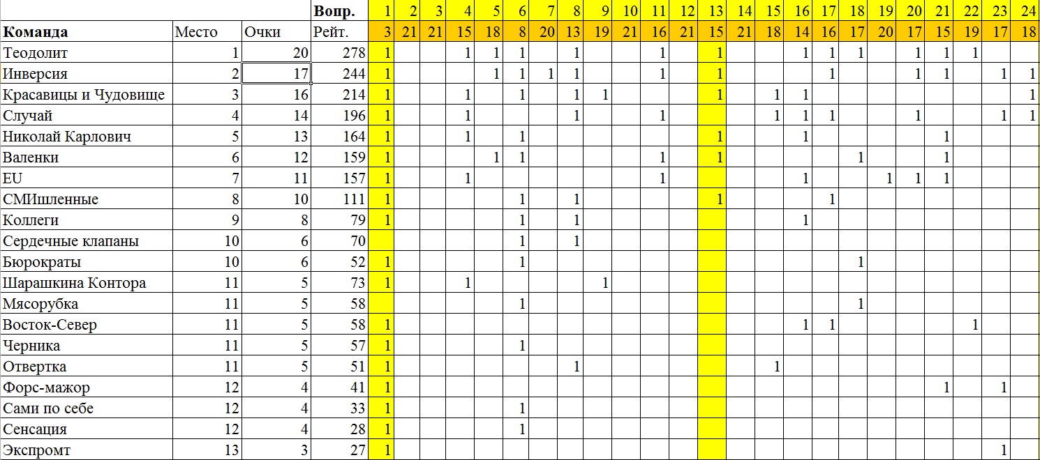 Без учета команды "Лисий ум" и команд Вуктыла, которым еще предстоит отыграть 6 тур. Вот он. Ценные кадры - Ухта Женская логика - Сыктывкар Додо Пицца - Сыктывкар Маразм - Сыктывкар ТриО - Сыктывкар Теодолит - Усинск Инверсия - Усинск Красавицы и Чудовище - Усинск ИТЦ - Ухта Случай - Усинск ЕУ - Усинск Расхитители гробов - Сыктывкар Печорский проспект - Печора Палата №6 - Сыктывкар Николай Карлович - Усинск Просто гении - Сыктывкар Валенки - Усинск ГИАСП - Сыктывкар Ростелеком - Печора СМИшленные - Усинск Б-52 - Ухта 8 команд из Усинска! И это еще Бета непонятно с чего пропустила 6 тур, тем самым вычеркнув себя из списка финалистов. Не знаю, как вы, друзья, но, например, моя команда уже купила билеты в Ухту -------------------- Мой Твиттер: https://twitter.com/mexbaza