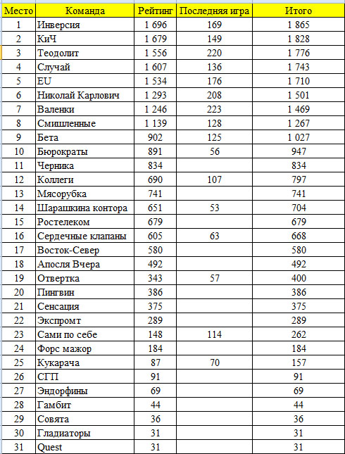 Господа знатоки! Поздравляю с окончанием сезона. Спасибо организаторам и вдохновителям. Поздравляю Теодолит с красивым окончанием сезона, последний бой он самый трудный. Спасибо за хорошую игру. Понравилось как Аскеров в конце нагонял на нас и на Валенки с Карловичами жути и адреналина. Поздравляю Инверсию с золотом, а КиЧ с серебром. Всем командам - успехов в следующем сезоне.