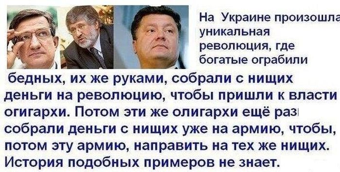 Один по крайней мере, по таможенным сборам, правильный подход, вот с этого и надо начинать. ссылка "Чудаки! Дайте мне ваш спецназ на месяц в Одессу, Ильичевск, Николаев - перекрыть порты, и обеспечить растаможку контейнеров, которые из них выпускают. Официально, в бюджет. И вам ничего не надо будет просить, я вам обеспечу бюджет всей вашей службы на год активных действий!" Депутат рассказал мне эту историю и говорит: "Юра, они не туда войска посылают. Если они оцепят порты и начнут растамаживать по официальным расценкам 100% грузов, нашей армии и милиции можно будет поднять зарплату в 5 раз. А если возьмут под контроль все границы, хотя бы на основных магистралях и организуют контроль, то Украине не нужен будет кредит МВФ! Сижу, жду, когда ж власти поймут, что антитеррористическую операцию надо проводить прежде всего там, где грабят Украину! Как думаешь они наведут порядок в портах?" |