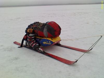 На сегодня мой выбор - это низкие санки с жесткой приподнятой серединой, шириной около 90 см, для груза в 40 кг достаточно метровых лыж (проверено). Их маленько матыляет по сторонам когда идешь, но зато становятся более поворотистыми при смене галсов, меньше шансов поломать носки.