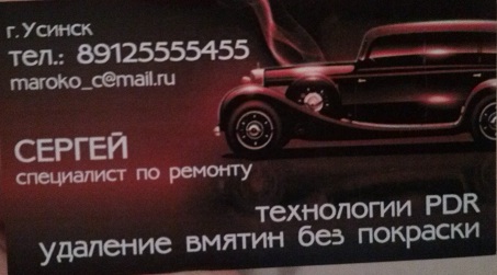 misham, так ты выкладывай номера...проблема то для нашего города серьезная(у кого вмятины не сильные) Вот его визитка действительна для нашего города с нашими расценками это реальная альтернатива для тех у кого не серьезные повреждения. Nord-Lion, вот тебе реально к нему можно заехать показать машинку, у тебя вообще плавная вмятина и проблем думаю не должно возникнуть. |