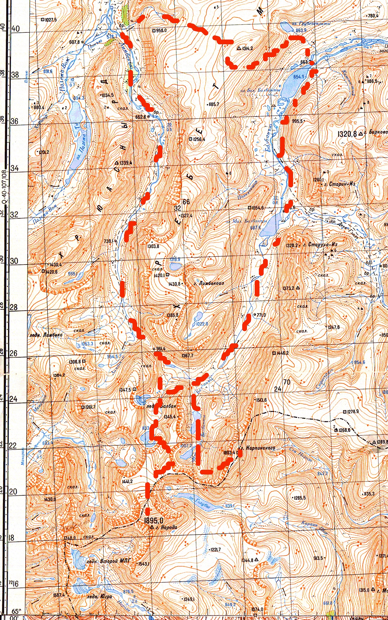 Дорога хорошая, шли легко. Несмотря на то что вышли позже хохлов на час, догнали их у стрелки Балбанью. Тут наши пути расходились, они шли на Народу и далее через перевал Кар-кар на Манарагу, а нам на перевал Карпинского (перевал №23) через озеро "Восьмерка".