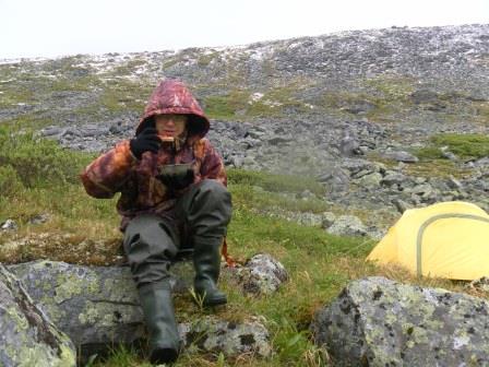 Кое-как нашли вокруг камней полянку под палатку. Приготовил ужин, разбавил себе чуток шильца, выпил за хозяина озера, за погоду и передал привет Войпелю - богу северного вертра. Попросил его нас полюбить и успокоить свой нрав.