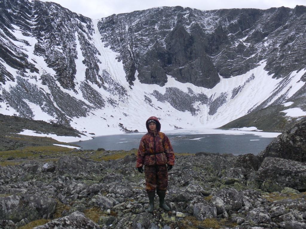 Поселок тут был основательный, есть развалины большой бани и коптильни. Рыбы тут нет, зато оленей полно. Видели еще 3 штук на Плато Карпинского, но фотик не взял. По коптильне видно что на крючьях скорее всего коптили мясо. Всю ночь дул ураганный ветер, а когда проснулись утром - зима.... Деваться некуда, сегодня нужно добраться до Малых Балбантов избушки с которой начинался маршрут, а 25 нас должны забрать с рудника Желанный. Двинулись в дорогу. Снежный заряды меняются дождевыми. По дороге нашел оромный раухтопаз в кварце, брать не стал, сфоткал, уж больно тяжелый.