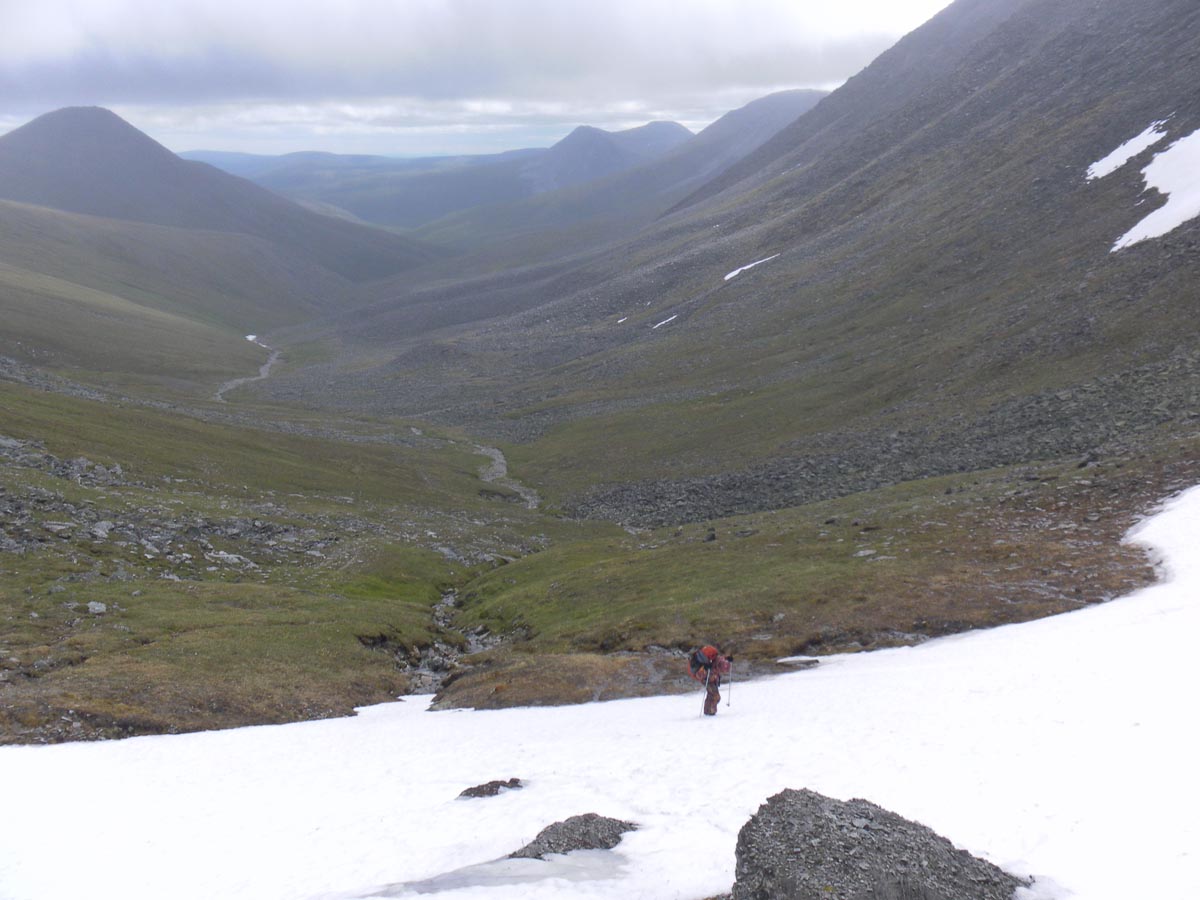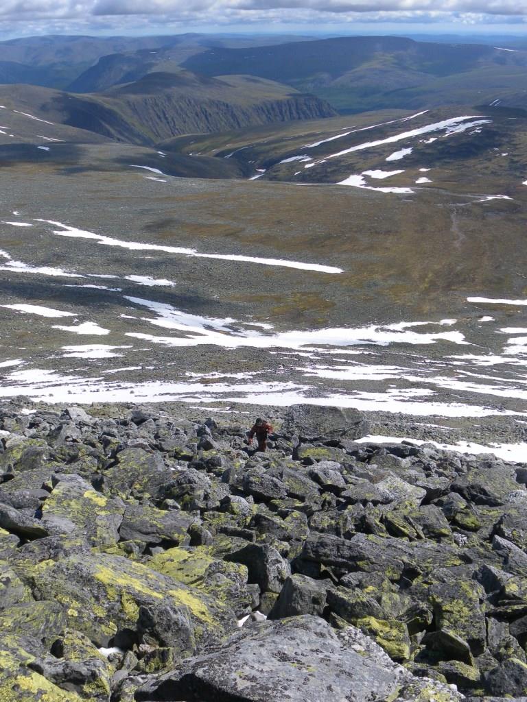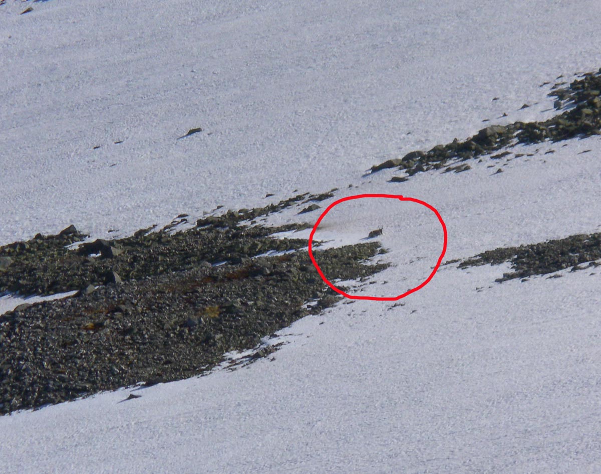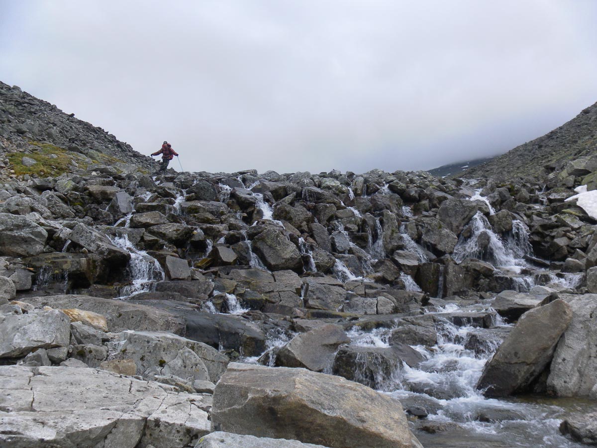 На спуск пошли быстрее. Но ноги уже все равно убиты, идем аккуратно, прыгаем по камешкам. Кроссовки конечно все в порезах, носки сбиты. При возможности стараемся идти по снежникам и ледникам, по ним проще. Видим дикого оленя, который сначала убегал, а потом просто лег и притворился камушком.