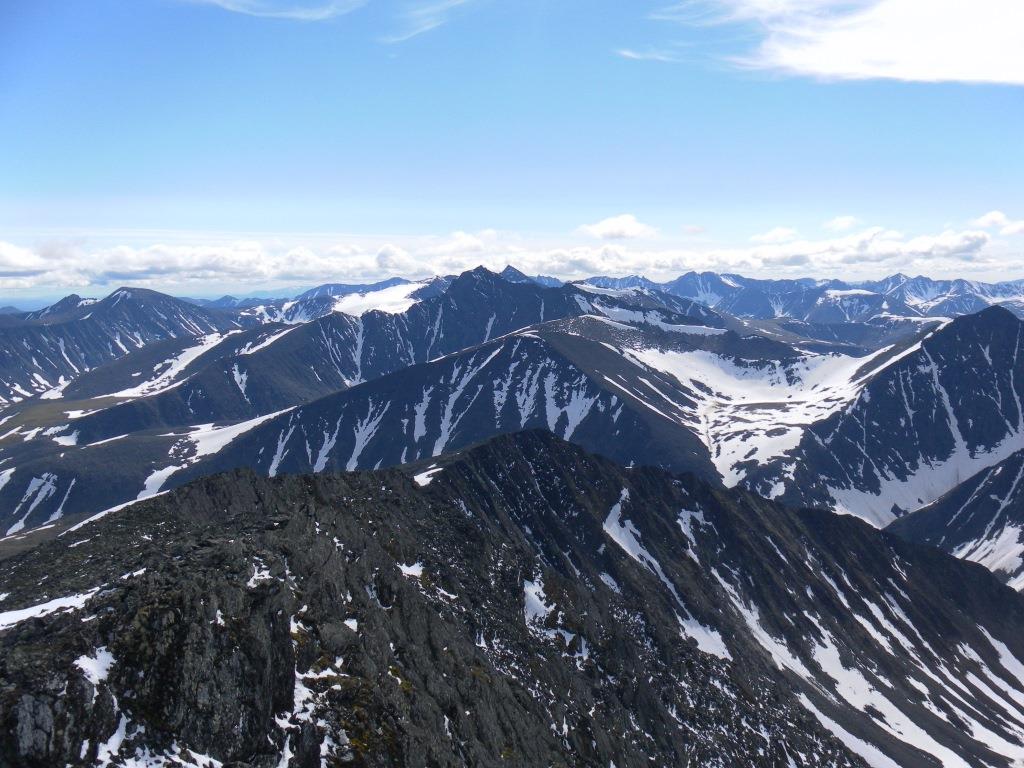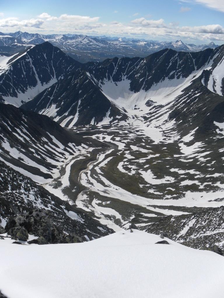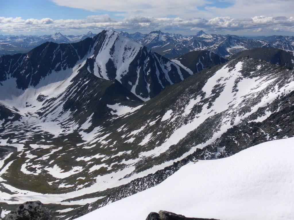 Отсюда уже просматриваются все самые высокие вершины Урала. Манси-Ньор, Пик Комсомола, Пик Янченко, Колокольня, Манарага, Защита, Свердлова, Колокольня Масленникова и другие.