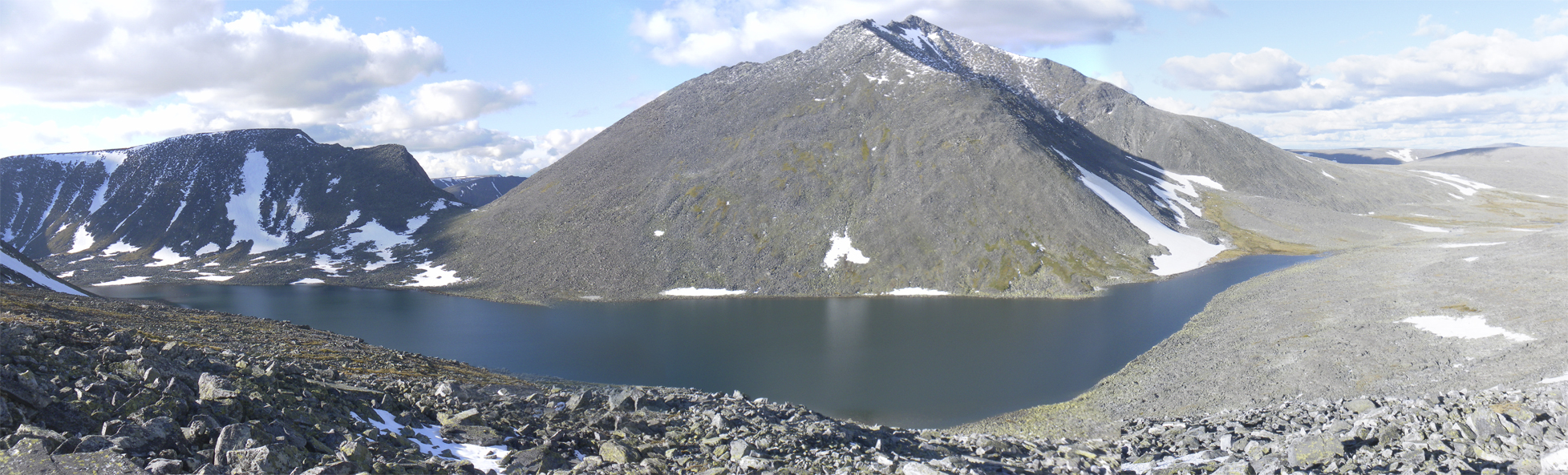 Спустились через плато Руин к озеру Голубому. Сделал панорамку. Наша палаточка выглядит крохотной точкой. Напротив возвышается гора Карпинского. Сам Карпинский никогда в этих местах не был. Все названия этим горам дал Алешков в своей экспедиции 1927-1929г.г., который считал себя учеником Карпинского. Мансийских и коми названий не сохранилось.