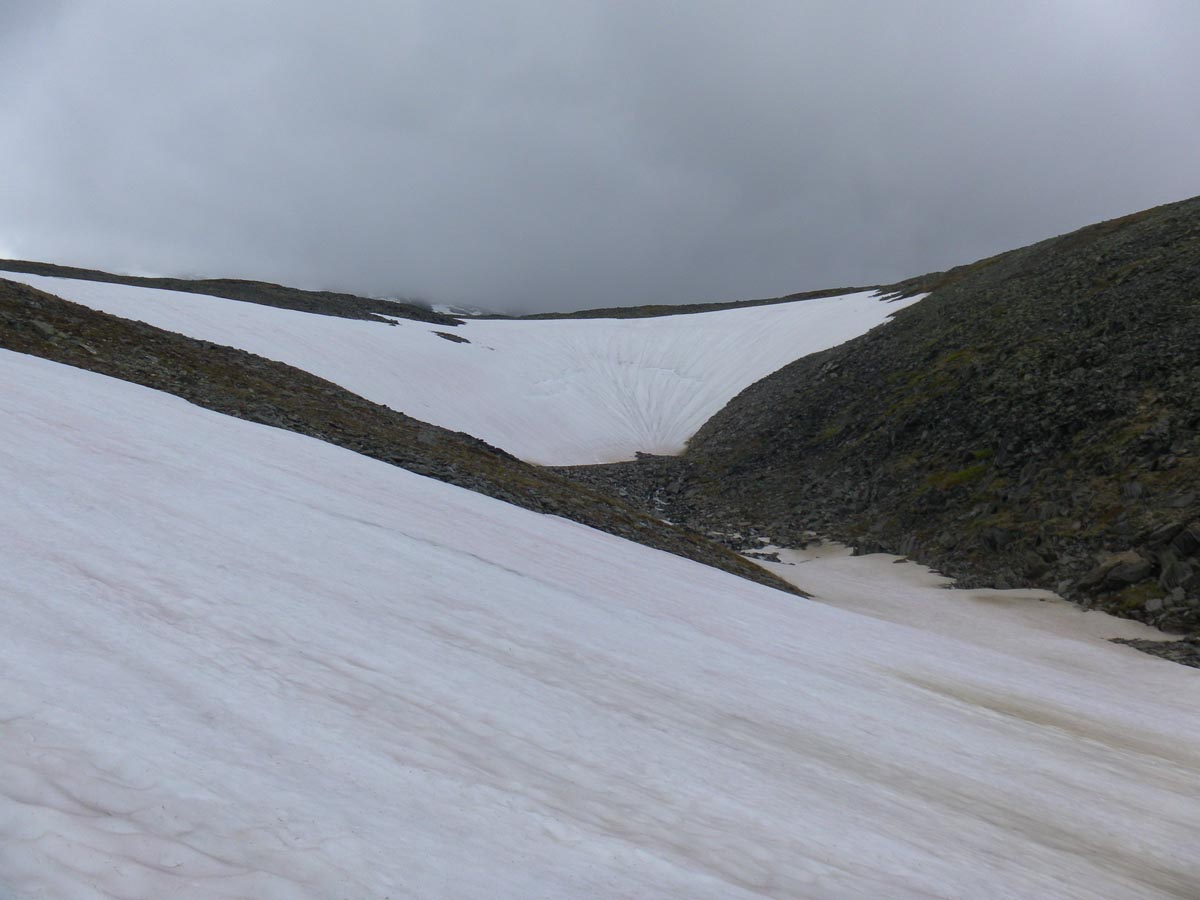 Вышли к последней ступени перевала. К сожалению фото не может передать крутизны склона и размеры валунов. Долго думал как его взять. В лоб как в описании с 30 килограммовым рюкзаком не реально. Пошли через снежник слева. Ногами долбили ступени и упирались лыжными палками. Крестился и молился в этот момент, чтобы не сорваться и не улететь по снегу вниз.