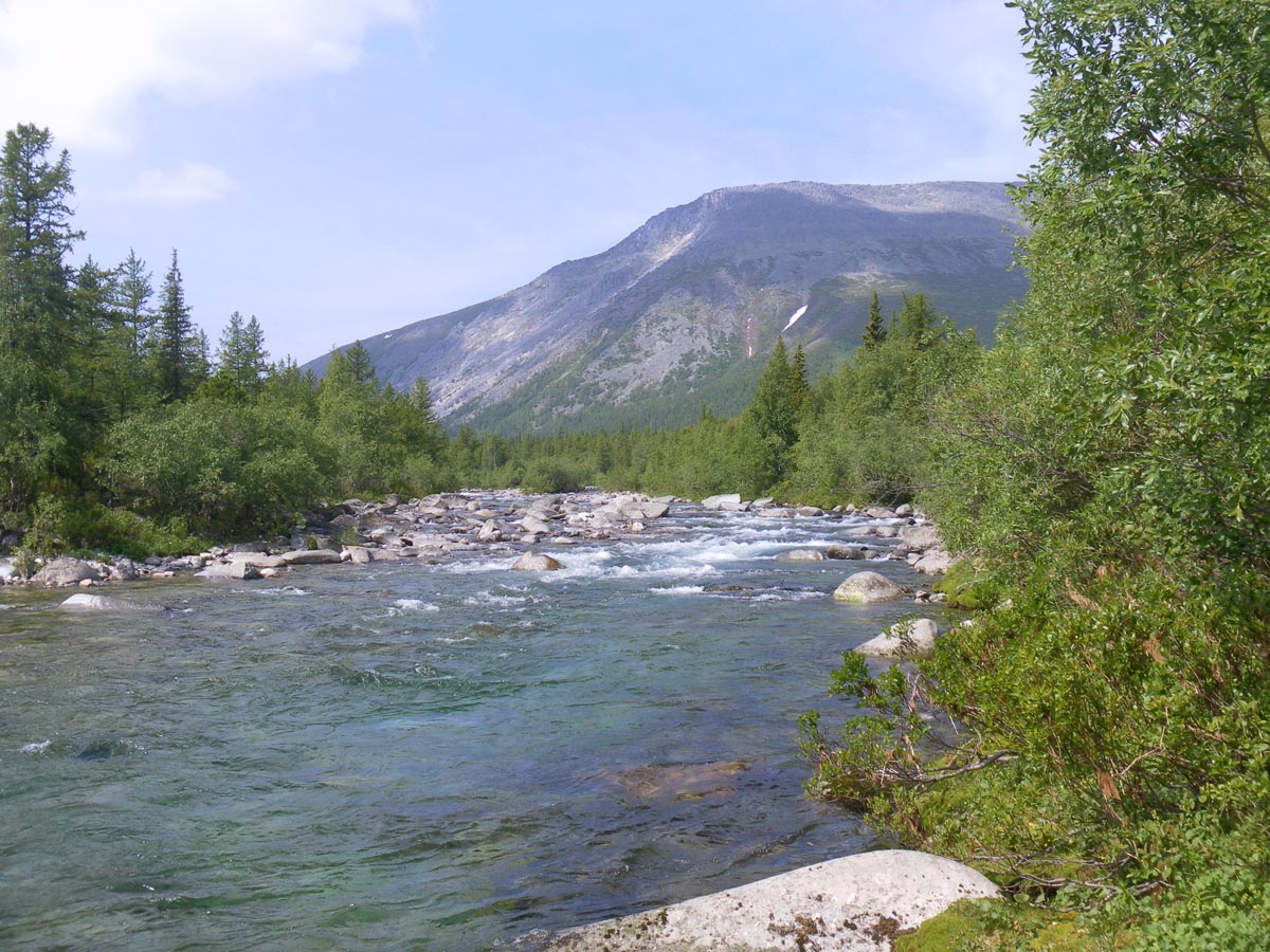 За рыбой пришлось идти до слияния Северной Народы и Народы, но рыбы так и не нашел. Перейти речку чтобы сбегать на озеро не смог, глубоко и сильное течение. Пошел вниз по Народе. Дорога отличная, сухая. Пролетел от лагеря 8 км и не заметил. Нашел еще развалины. Дорога привела к переправе. Выхожу, смотрю за кустами стоит на задних лапах. Сердце ушло в пятки, из оружия только нож. Стоит спиной и через кусты. Поворачивается лицом, блин.... отпустило, человек! Подхожу ближе, точно человек. Весь мокрый, переходил реку. В воде еще несколько туристов идут в брод. -Ну ты меня и напугал - говорю. В общем познкомились. Группа из Москвы. Закинулись с Инты на Народу через Кожим. Идут на сплав на катамаранах до Саранпауля, решили сделать пешую радиалку на г.Народную. Двое в возрасте по 60 лет, семейная пара в районе полтиника и один моих лет. Хотят за 3 дня успеть, маршрут через наш лагерь. Спросил где рыба, говорят 12 км ниже по течению. Плюнул, думаю нафик надо. Пошли с ними в наш лагерь. По пути ребятки отстали от меня на 1,5 часа. Взвесили свои силы и от маршрута на гору отказались. Остались у нас ночевать. Достали шила, принесли хлеба (у нас уже все закончилось, были крупы, колбаса и тушенка). В общем был праздничный банкет за знакомство. Компания приятная, разговоры в основном только о маршрутах, кто где был, что видел, что ловил, никакой политики. Утром обменялись контактами и сфоткались на прощание. Нам домой, а им на 2 недели плаванье и рыбалка.