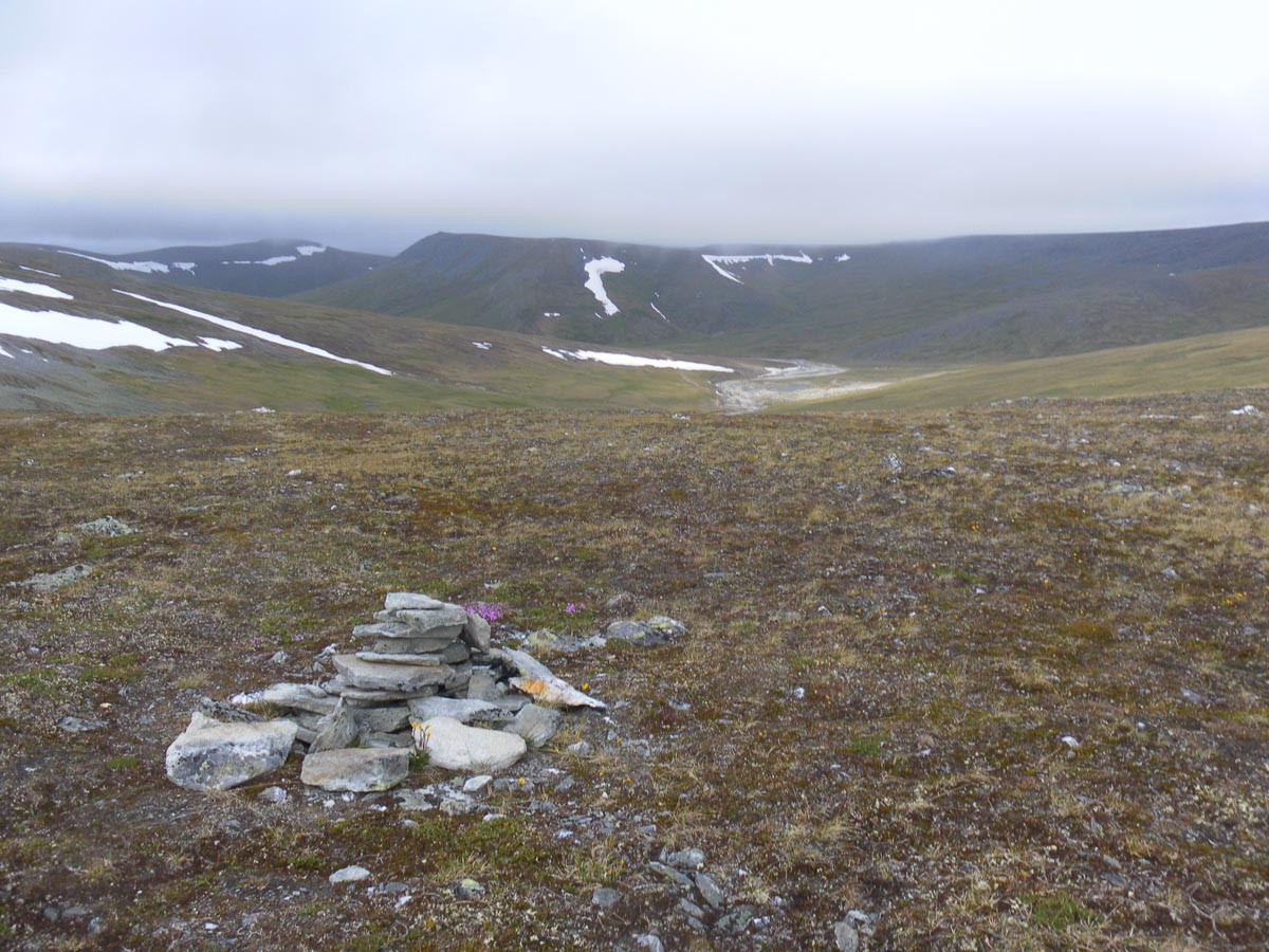 Домой на перевал идет хорошая дорога. Но по мере подъёма и приближения к Европейской части погода ухудшается, ветер шквальный, холодный, с зарядами дождя. Идти не сложно, но продувает насквозь. Последняя ступенька перевала, самая крутая и в снегу. Как тут мог вездеход проехать ума не приложу, разве только зимой. Сам перевал Некрещеный получил своё название тоже в годы экспедиций Алешкова. На всех перевалах коми устанавливали кресты, а на этом перевале креста не было. Об этом нам поведала Елена Шубницина, с которой мы познакомились в конце маршрута на Желанном. В общем последнюю ступень проходили по очереди, если первый подскользнется и сорвется, чтобы не сбил второго. Первым пощел я, ногами рубил ступени. Когда добрался дал команду Артему. Ветрище ужасный, шатает из стороны в сторону, но вполз, молодец.