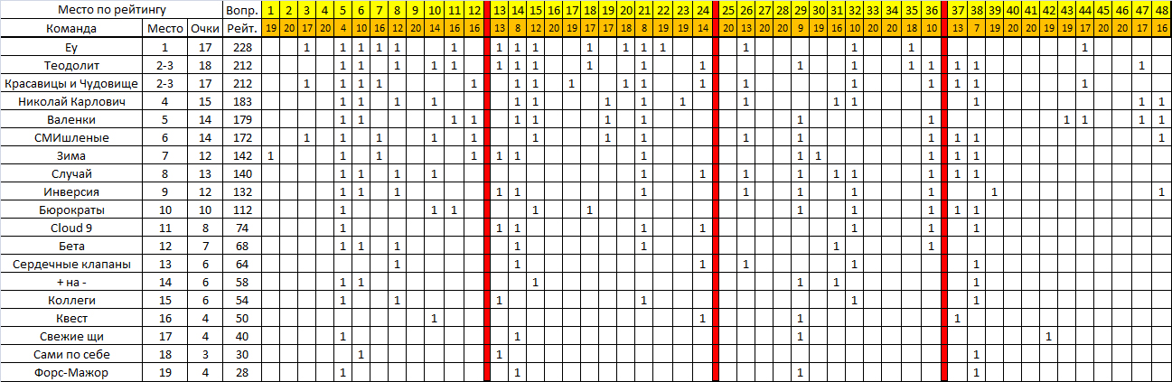 Чаровница! Спасибо за открытия новой странички 2015 чгк. Игра под громким названием кубок северных городов показал, что усинские команды в пятерке сильных. Вопросы Авдеенко оказались какие то"слабенькие". Все команды поздравляю с началом новой сезона. Да победит сильнейший О да! Начало было отличным! ) Да, как-то неожиданно легко было, но в тоже время и было над чем подумать. )) Сам Дмитрий - очень яркий и необычный человек. Мне он даже понравился больше, чем Аскеров (но это моё впечатление). Приятно было увидеть знакомые лица, любимые команды-соперники. "Спасибо" организаторам: приятный зал, быстрые отзывы на просьбы, шикарная музыка в перерывах. ) И совсем отдельное "спасибо" за награждение. ) |
