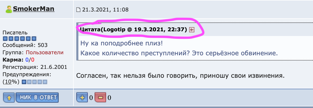 3. НА ФОРУМЕ ЗАПРЕЩАЕТСЯ Если ты посмотришь детали его Предупреждений, то этот пунк там и указан. Причем, я не являюсь действующим юристом, который может безошибочно определить в сообщении нарушение законов РФ. Как и никто из Модераторов. Поэтому это Форум, не суд.----------------------------------------------- 3.1. Создавать сообщения, противоречащие текущему законодательству РФ; Еще раз, повторю (в последний) - если ты находишь в его действиях состав преступления - то обращайся в соответствующие органы. Прекращай уже этот цирк тут. Я его оскорблять начал? Я его на рыбалку приглашал, а в ответ гнусный высер. Ты не начал, но продолжил и неоднократно. Если не помнишь я тебе скину скрины сообщений. Сейчас это в корзине.-------------------- "Я люблю этот город, но зима здесь слишком длинна" (С)