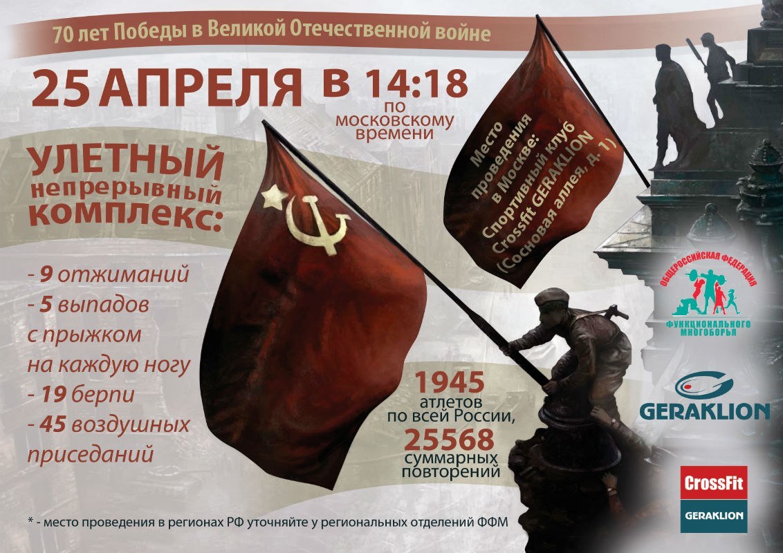 Данный флешмоб будет проводится на территории Российской Федерации, организованный Фондом «Гераклион» и Всероссийской федерацией функционального многоборья. Не будьте в стороне и станьте частью большого события! По итогам флешмоба будет смонтирован единый видеоролик, который будет размещаться в сети Интернет. Предлагается выполнить за минимальное время следующий комплекс упражнений: — 9 отжиманий — 5 выпадов с прыжком на каждую ногу — 19 берпи — 45 воздушных приседаний Центральным местом проведения акции станет клуб CrossFit GERAKLION в Москве. Однако лишь столицей акция не ограничится — Победу ковала вся страна. Синхронно с Москвой в разных населенных пунктах России — от Калининграда до Владивостока — задание выполнят 1945 атлетов, которые суммарно сделают не менее 25 568 повторений, что соответствует числу мирных дней после окончания войны. Старт мероприятия намечен на 14:18 (именно столько дней длилась ВОВ)! Проверь себя и стань частью важного события! -------------------- [b]"Толпа так же напоминает армию, как куча стройматериалов дом." "ВОЙНА-ЭТО ИСКУССТВО ОБМАНА" (Сунь Цзы)