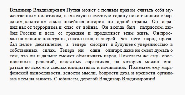 Необычное поздравление В.В. Путина с днём рождения от неизвестного автора. Не забудьте перечитать ещё раз, но уже через строчку. -------------------- Можно жить так, но лучше ускориться. ©Ленинград