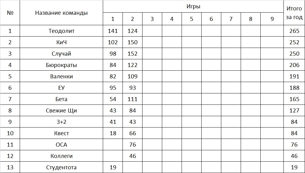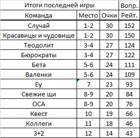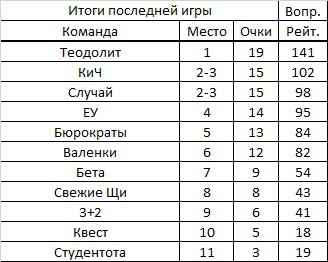 Учитывая тот факт, что два вопроса были сняты. Один из-за некорректности редактуры, второй из-за ошибки ведущего, баллы распределились следующим образом.