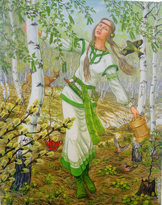Ну вот она и пришла... А чего это девушка в старо-русском стиле с берестяным бидончиком делает весной в лесу? Вроде ни ягоды, ни грибы еще не созрели.