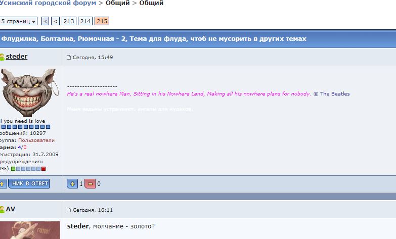 steder, молчание - золото? Тебе виднее. Или нет? Может картинка не прогрузилась? -------------------- He's a real nowhere Man, Sitting in his Nowhere Land, Making all his nowhere plans for nobody. © The Beatles